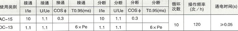 (6)辅助触头:在不装欠电压脱扣器和分励脱扣器时,可装辅助触头。辅助触头额定值见表3;接通和分断能力见表4;电寿命试验参数见表5;寿命次数为印50次。