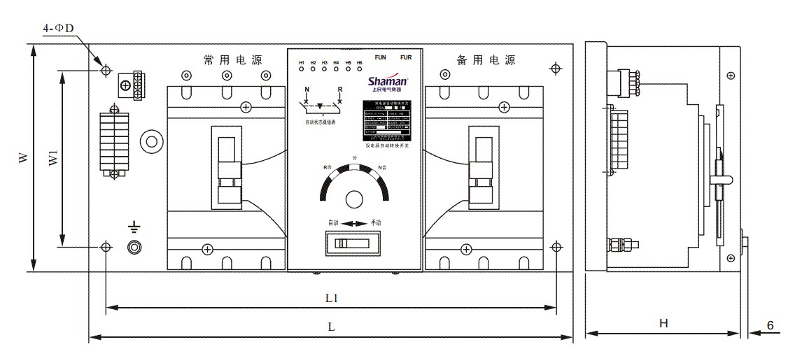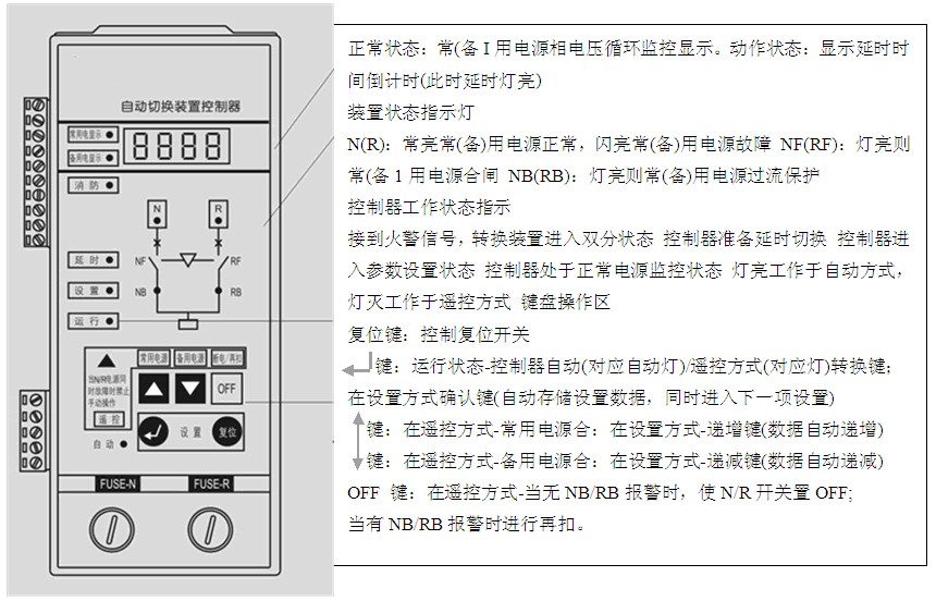 B型:其功能包括:手动-自动转换、失压、欠压、超压与断相转换、转换延时设置,提供发电机启动触头,LED显示。可增加消防